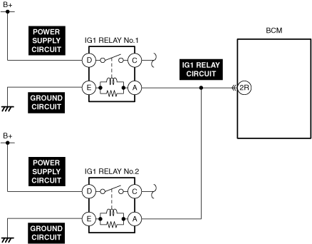 • The body control module (BCM) detects a short to power supply in the IG1 relay circuit.